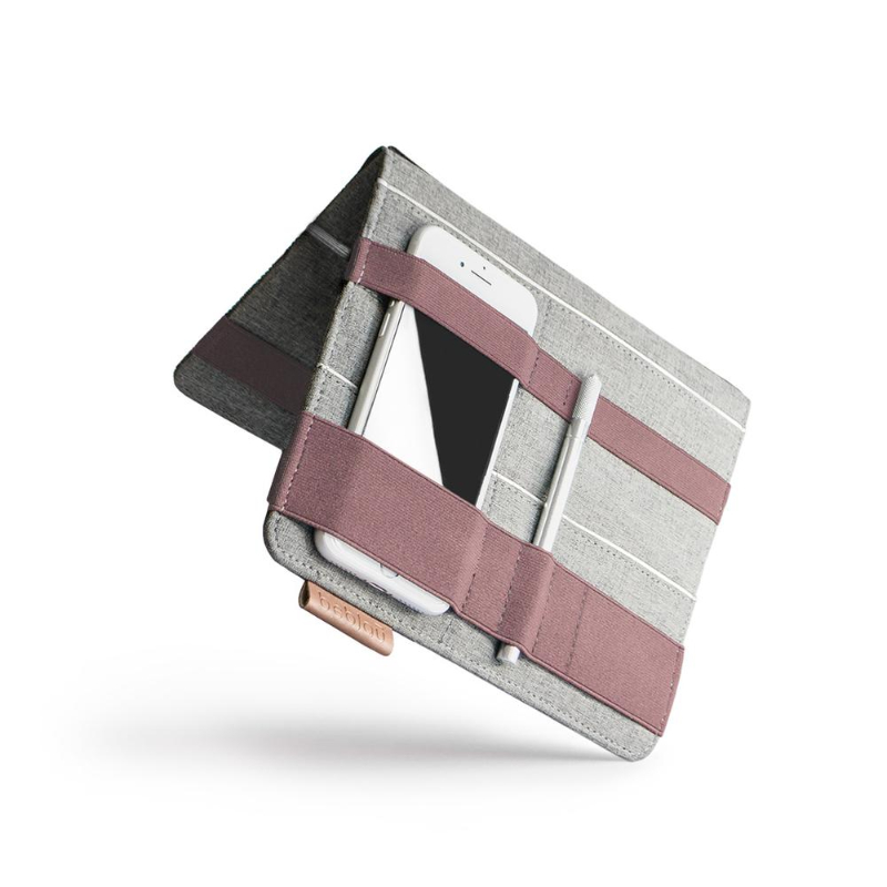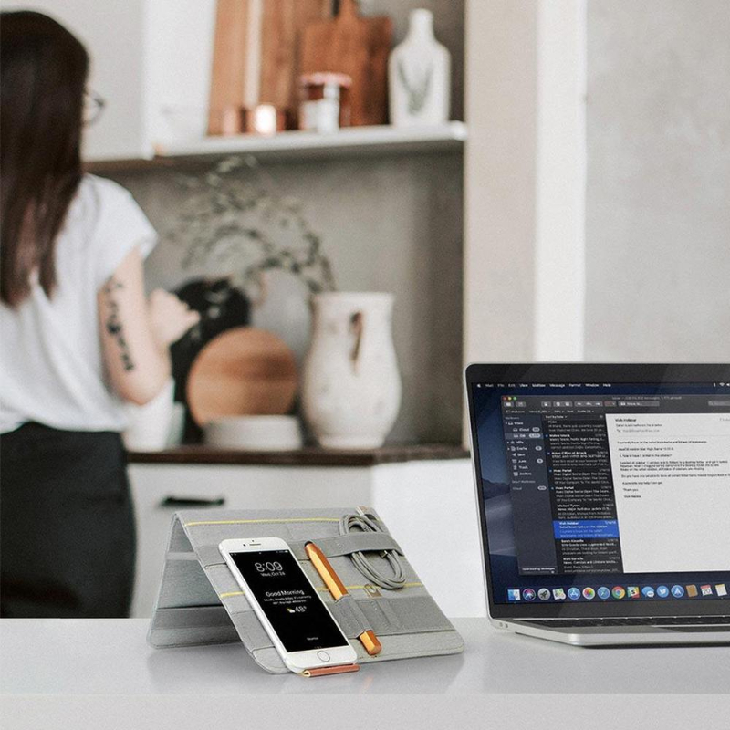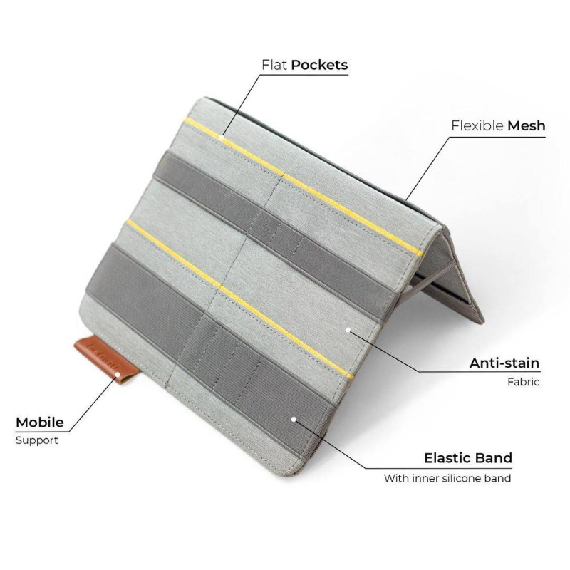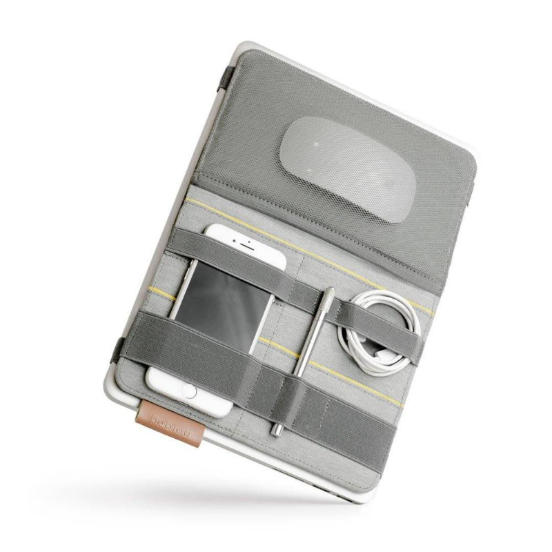 Capa para acessórios, adere de forma plana a um portátil de 13, 14 e 15″ por meio de 2 elásticos, ou fica pousado em posição de stand.