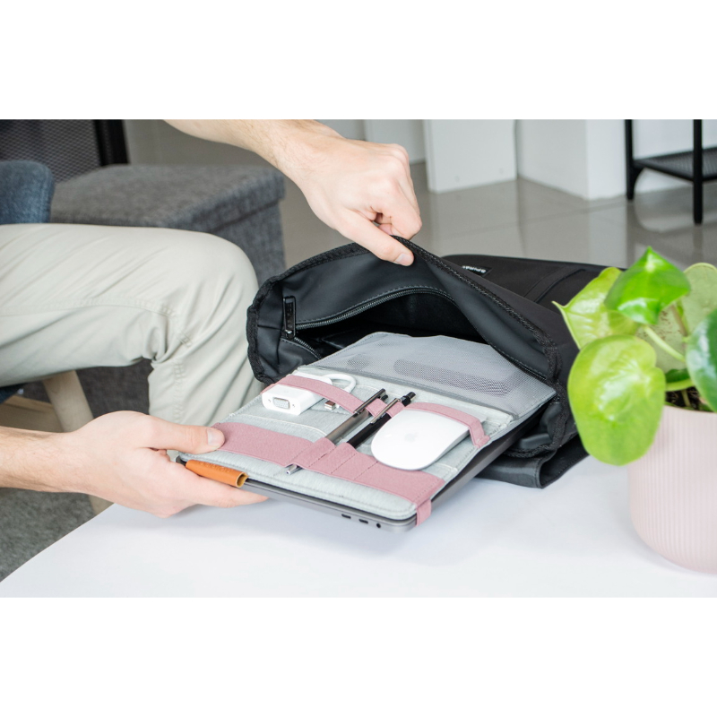 Tem bolso em rede, elásticos e bolsos planos de vários tamanhos que permitem guardar e organizar cabos, rato, canetas, documentos, telemóvel, etc.