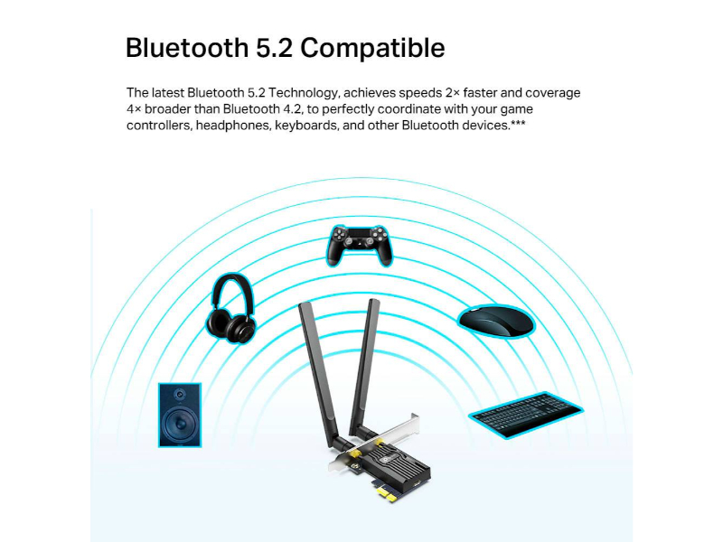 A mais recente tecnologia Bluetooth 5.2, atinge velocidades 2× mais rápidas e cobertura 4× mais ampla do que a Bluetooth 4.2, para coordenar perfeitamente com os seus controladores de jogo, auscultadores, teclados, e outros dispositivos Bluetooth.