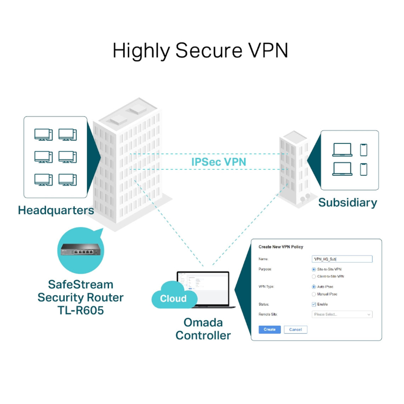 TL-R605 suporta IPSec / PPTP / L2TP VPN sobre protocolos IPSec / SSL. Com um design de hardware poderoso, o roteador oferece suporte e gerencia conexões de até 20 x LAN-to-LAN IPsec, 16 x OpenVPN *, 16 x L2TP e 16 x PPTP VPN. O IPSec VPN automático com um clique simplifica muito a configuração da VPN e facilita a gestão e a implantação da rede, ao mesmo tempo em que protege e criptografa as comunicações de dados privadas entre sites que viajam pela Internet.